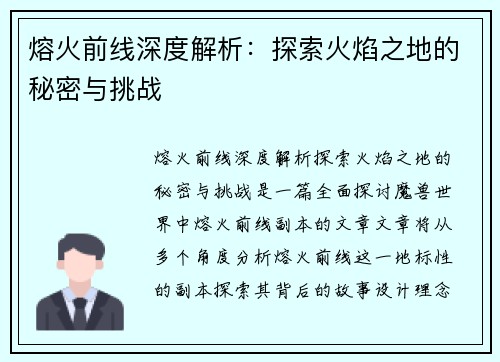 《熔火前线深度解析:探索火焰之地的秘密与挑战》是一篇全面探讨《魔兽世界》中熔火前线副本的文章。文章将从多个角度分析熔火前线这一地标性的副本,探索其背后的故事、设计理念、难度挑战、以及与玩家之间的互动。通过这篇文章,读者将了解到熔火前线不仅仅是一个简单的副本,它更像是一个充满隐秘历史和严峻考验的“火焰之地”,其中隐藏着丰富的游戏机制、策略与故事情节。从熔火前线的历史背景,到副本设计的细节,再到面对的挑战与奖励,本文将为玩家提供一个全方位的理解视角,带领大家深入火焰之地,探索那里的每一个秘密。